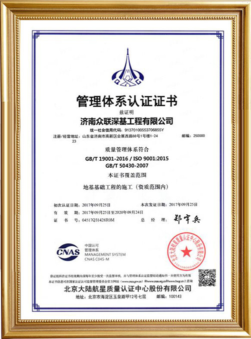 山東眾聯恒信工程集團有限公司成立于2010年4月20日,注冊資金2000萬元,固定資產8500萬元,公司主要從事地基基礎、勘察、設計等方面的專業承包,地基基礎專業施工資質壹級。